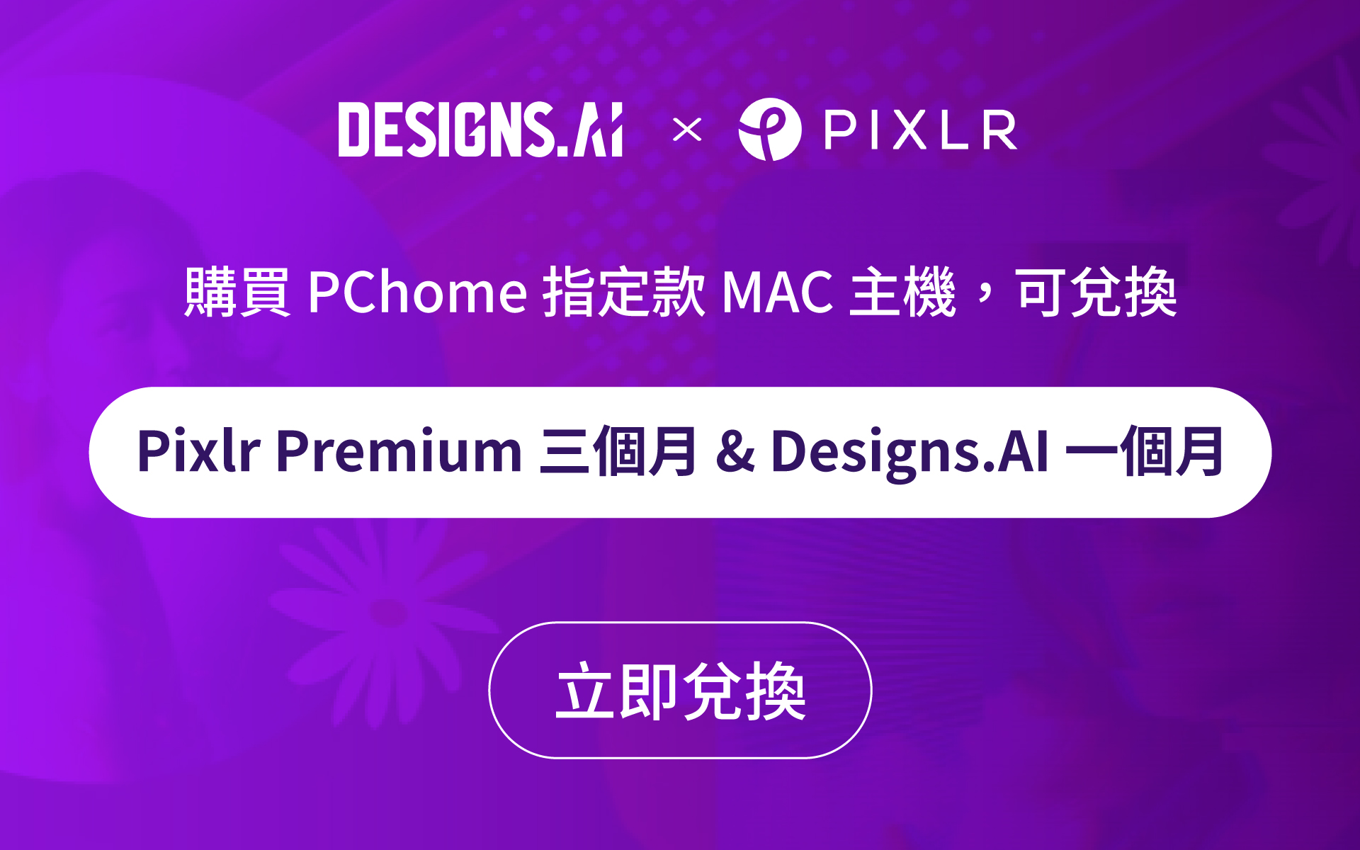 購買 PChome 指定款 MAC 主機,可兌換 Pixlr 3 個月 & Designs.AI 1 個月授權。